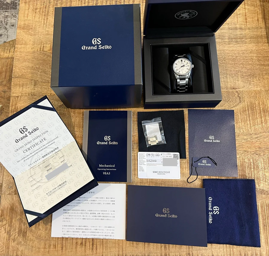Comes with outer box, inner box, warranty card dated January 2022, GS inspection certificate, GS pouch, instruction booklet, hang tag and spare links to complete the bracelet.